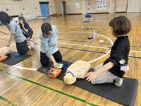 傷病者の意識レベルの確認の仕方、胸骨圧迫の仕方、AEDとの組み合わせ方など、繰り返し練習しました。