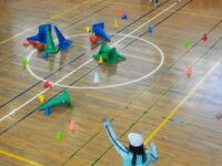 次は、中央に立てた大小さまざまなコーンにボールを当ててコーンを倒すというゲーム。