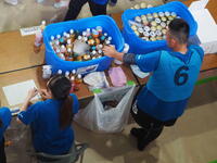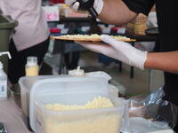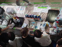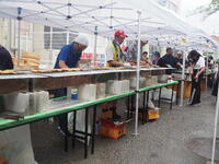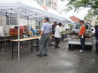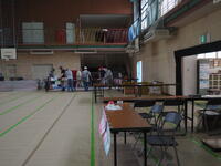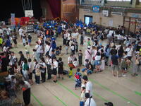小雨が残る中でしたので、会場を校庭からが体育館と昇降口前へと変更して準備を始めました。
