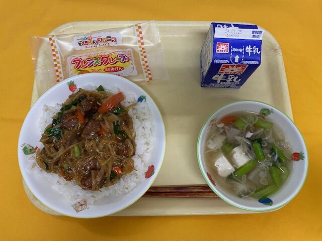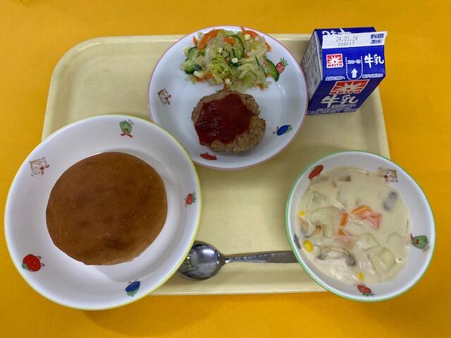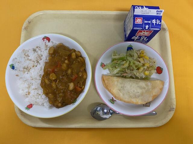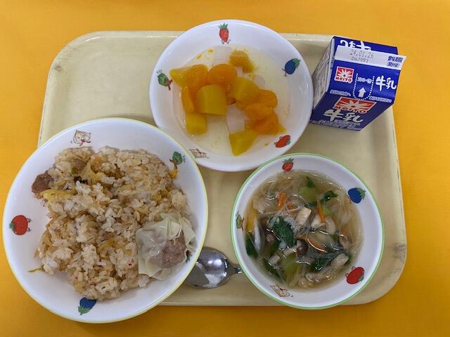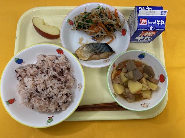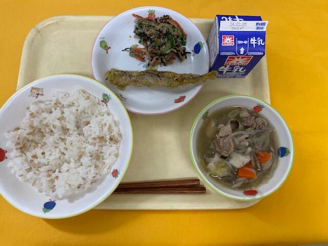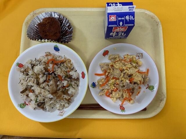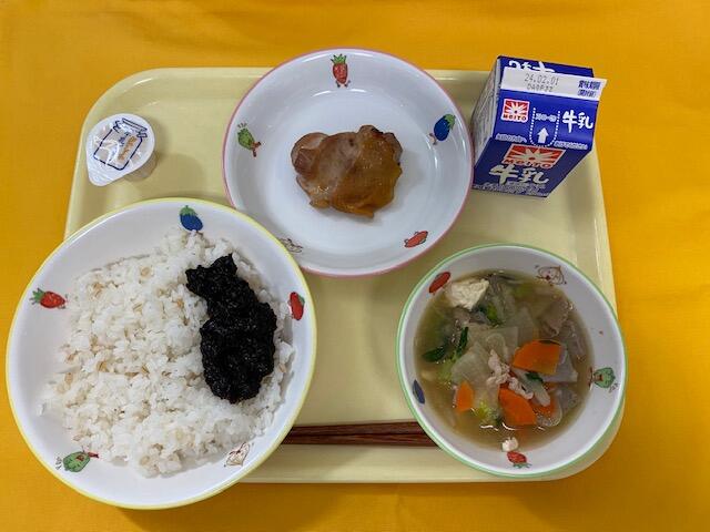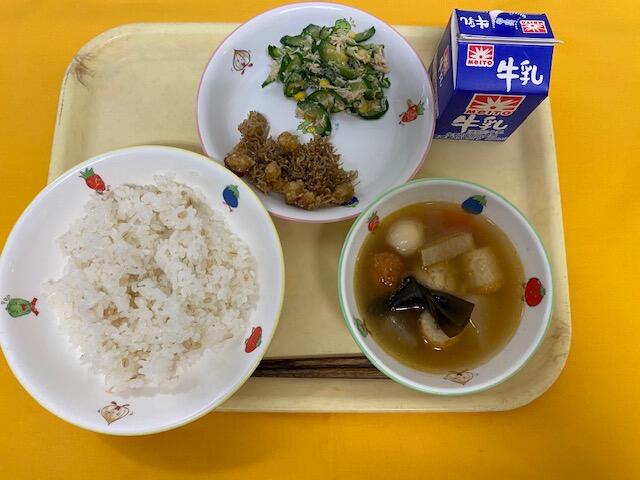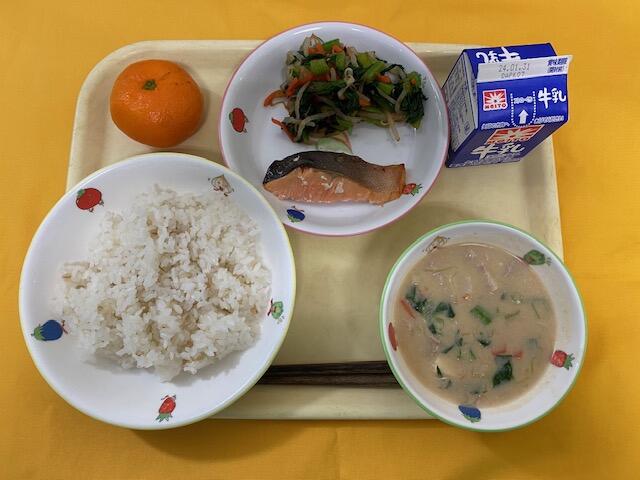 給食の始まりは明治22年、「おにぎり、塩鮭、漬物」という献立でした。