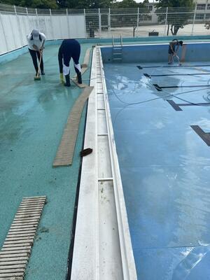 予報に反して陽が差して暑くなった午後、2時間半をかけてプール本体・プールサイド・シャワー室・トイレなどをキレイにしてきました。