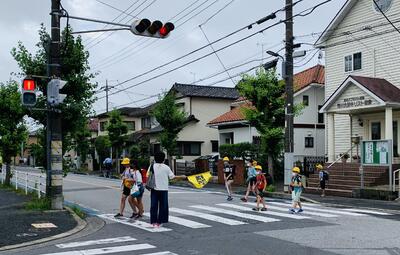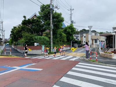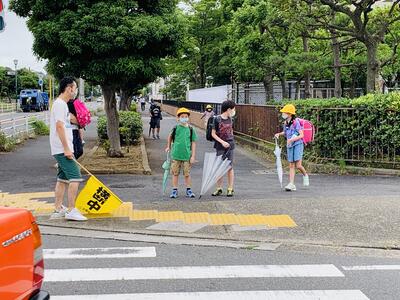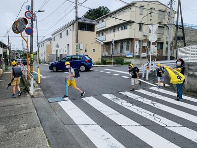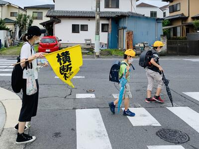 車の通りが多い危険箇所に、「横断中」の黄色い旗を持って、子ども達への声かけをしまた。