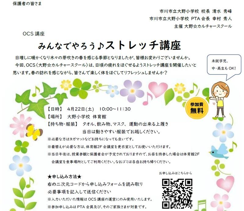 4月22日(土)の午前中に、保護者を対象としたストレッチ講座を開催いたします
