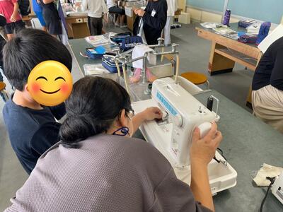 この時期、5,6年生は家庭科でミシンを使った授業をしており、ぜひお母さん方の力を貸して欲しい!という学校からの要望を受けて、保護者ボランティアで募ったお母さま方に授業のお手伝いをしていただきました。
