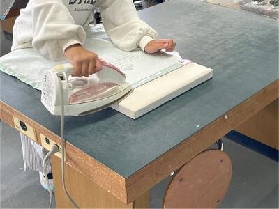今回は5年生のエプロン作りをお手伝い。ミシンだけでなくアイロンも使用していて、お母さん達は大活躍でした!