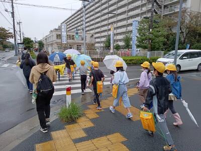 10月21日、雨で順延になった1年2組と3組の校外活動(虫取り)をサポートする交通指導をおこないました。