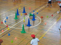 次は、中央に立てた大小さまざまなコーンにボールを当ててコーンを倒すというゲーム。