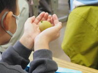 急遽、梨農家岡本さんが教室で「摘果」体験と授業をしてくださいました。