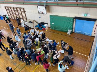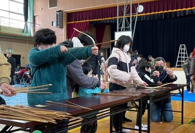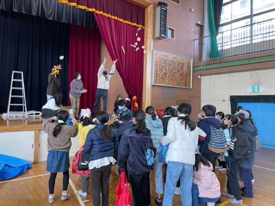 今日のイベントは、子どもたちに昔のあそびを体験してもらうこと、また豆まきならぬお菓子まきをおこない、福を呼ぼう!!を目的としていて開催され、未就学児を含む約150名の子どもたちが参加しました。