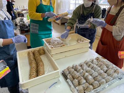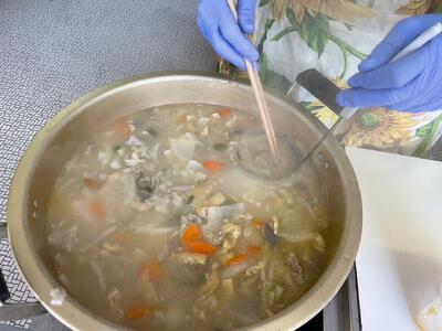 ・4~6学年の副学級長さんと役員会で、豚汁とおにぎりを作り、配付しました。