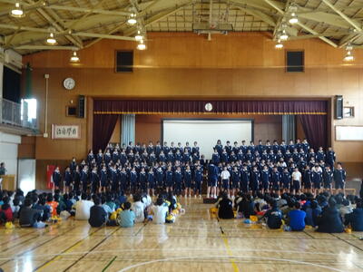 入学式では、大洲中学校の生徒として、新入生144名を迎え入れることができました。担任の先生の呼名に精いっぱいの返事で答えている新入生の姿がとても印象的な入学式でした。