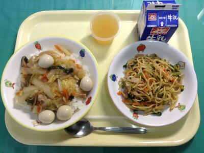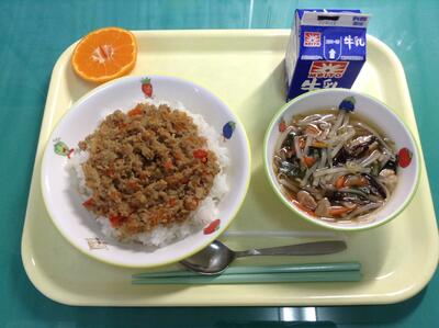 焼き鳥丼、和風サラダ、ニラ玉スープ、ぽんかん、牛乳