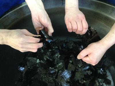 ↑ 板ノリを手でちぎって、出汁の中に入れています。板ノリを出汁の中で1時間ほどふやかします。