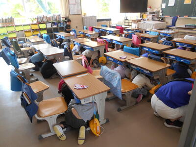 5月1日、新しい学年になって初めての避難訓練を実施しました。地震発生訓練の放送が入ると、素早く机に潜り込み、その後私語をせず、落ち着いて避難をしていました。訓練後、1年生は消防車を見学させてもらいました。