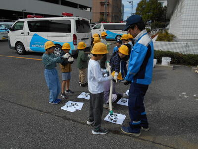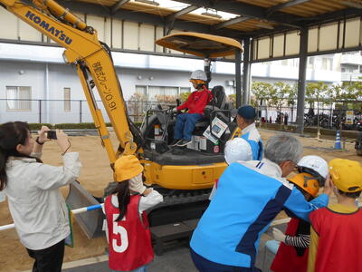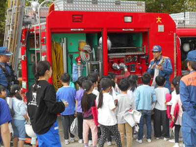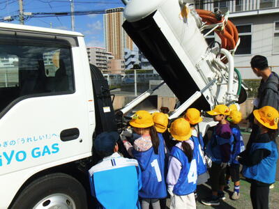 10月28日、1年生は学校近くの京葉ガスに行き、いろいろな「はたらくじどう車」を見せてもらいました。普段では乗ることのできないシャベルカーに乗せてもらったり、ガス漏れ時の緊急車両の中を見せてもらったりするなど、特別な体験をしました。