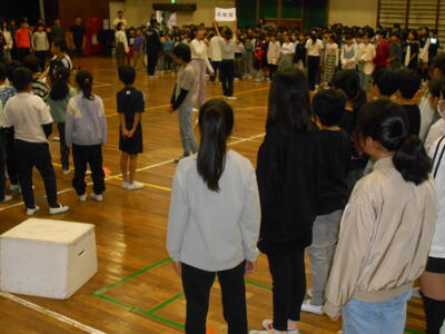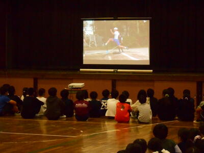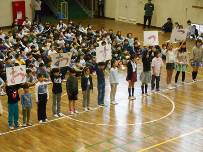 10月20日、24日(金)に開催される市内陸上競技大会に向けて、「陸上部を応援する会」を行いました。日ごろの練習の様子を紹介し、大会に出場する子たちはその決意を述べていました。全校のみんなからは、温かい声援が送られていました。