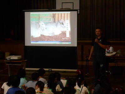 7月1日、4年生は社会科の千葉県の特色ある地域の学習や、総合的な学習の一環として、牧場体験学習を行いました。館山市にある牧場や、ミルクマイスター、大手乳業メーカーの方が来校し、牛乳の秘密や酪農等について、詳しく教えていただきました。