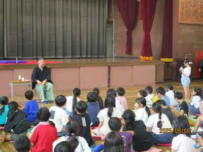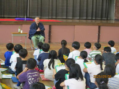 9月8日、4年生は落語教室を行いました。落語家の三遊亭圓福さんを体育館にお招きして、日本の古典文化を楽しく学びました。小道具の使い方や声の出し方、しぐさなどを教わるとともに落語の世界に引き込まれていました。