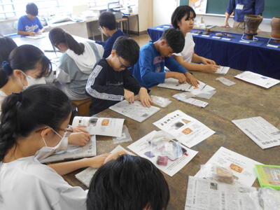 10月9日、県教育庁文化財課の職員の方に来校していただき、6年生は土器の説明や火起こし体験、黒曜石で切る体験などを行いました。体験活動を通して、歴史の学習を深めていました。