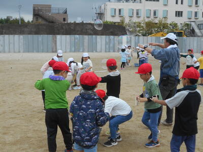 10月15日、理科や生活科に詳しい方に来校していただき、1年生はシャボン玉教室を行いました。大きめな縄に初めは戸惑いながらも次第にコツをつかみ、大きなシャボン玉を作っていました。1年生は大喜びで活動していました。