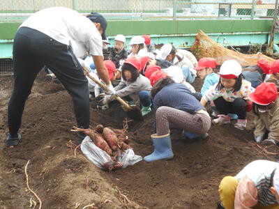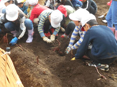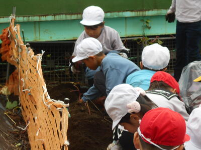 10月27日、昨日までの雨が止み、1年生はサツマイモ掘りをしました。事前に教務の五関先生や用務員の池田さんがサツマイモのつるを切っておいてくれたので、イモ掘りがしやすくなっていました。掘ると大きなサツマイモが現れて、1年生は大興奮でイモ掘りを楽しんでいました。