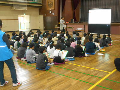 11月26日の放課後、読み聞かせボランティアの「こんぺいとう」のみなさんが、体育館にて読み聞かせ会を開いてくれました。ペープサートや大型スクリーンでの読み聞かせ、ブラックシアターと、様々な手法で子どもたちを物語の世界に引き込んでくれました。