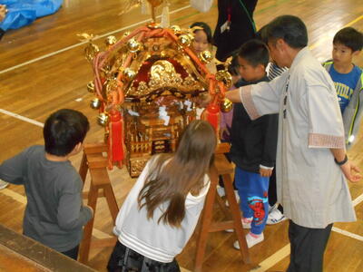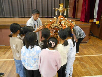 10月31日、3年生はお祭りやお神輿のことについて、地域の方からお話を聞きました。子どもたちは真剣な眼差しで画像を見ながら話を聞いていました。お神輿が登場すると、興味深そうに観察をしていました。