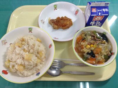 ポテトピラフ、鶏肉の梨ソースがけ、ABCスープ、牛乳