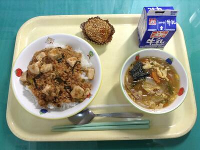 麻婆丼、中華風コーンスープ、さつまいもごま団子、牛乳