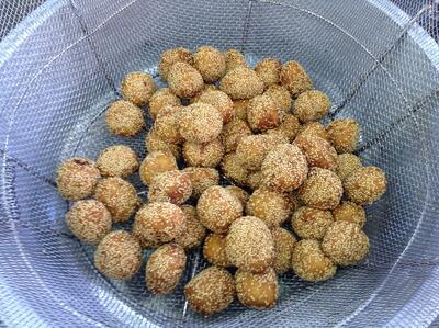 ↑ 白いりごまをつけた団子を揚げていきます。(170℃、約7分)