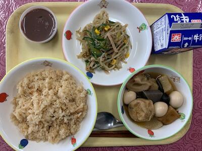 (献立): 茶飯、牛乳、おでん、野菜とハムの和え物、ココアプリン