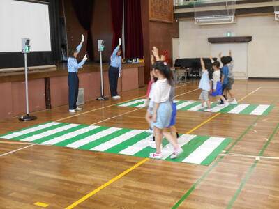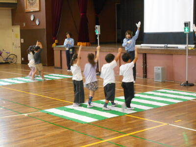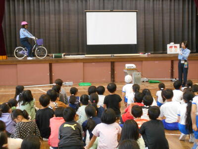 5月31日、市役所の交通計画課の方が来校し、体育館にて交通安全教室を行いました。3年生は自転車の安全な乗り方について、1年生は道路の歩き方や横断歩道の渡り方などについて学びました。