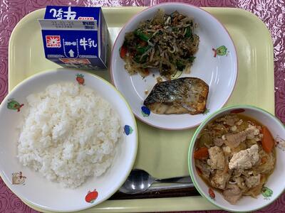 (献立): ごはん、鮭のマヨネーズ焼き、肉じゃが、みそ汁、牛乳