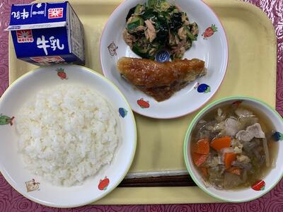 (献立): 豚肉と小松菜のあんかけごはん、わかめスープ、りんごとさつま芋の煮物、牛乳