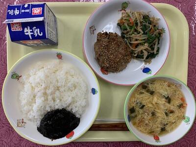 (献立): ごはん、豆豆ハンバーグ、切り干し大根の煮物、みそ汁、牛乳