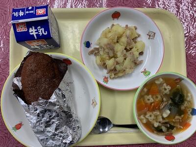 (献立): ココア揚げパン、ジャーマンポテト、お星さまのパスタスープ、牛乳