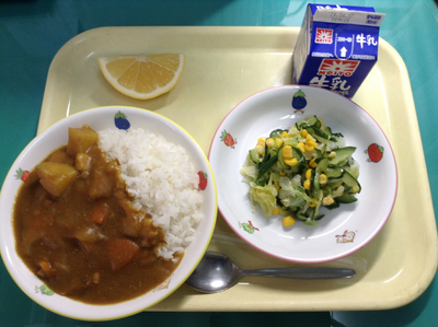 チキンカレーライス、コーンのサラダ、小夏、牛乳