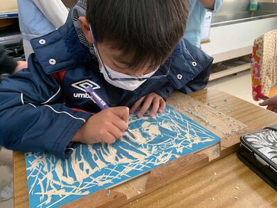 彫刻刀の使い方を学んだ4年生は、木版画に取り組んでいます。テーマは動物です。