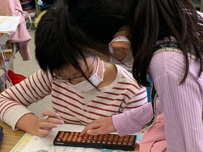 使い慣れていないそろばんですが、たし算・ひき算をする時に、「5をつくる2つの数」や「10をつくる2つの数」の考えを使います。位取りの理解を確かにし、計算力の向上につながると言われています。