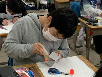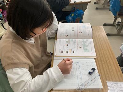 2年生の教室をのぞいてみると、折り紙で今年の干支のうさぎを折り、絵馬をつくっていました。