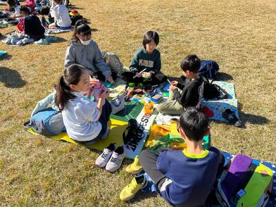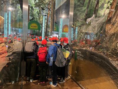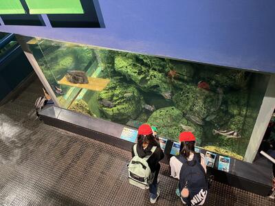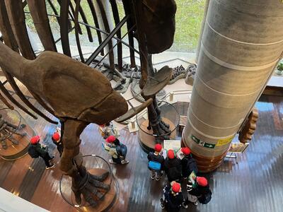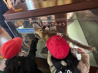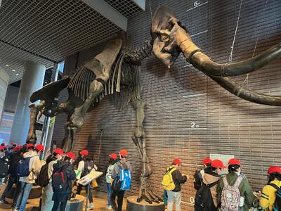 迫力のある恐竜やマンモスの骨格標本に驚いたり、普段見られない植物を虫眼鏡で観察したり、動物に触れてみたりと、子どもたちは熱心に見学をしていていました。色々な発見があったようです。