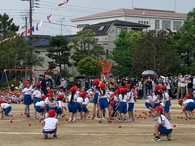 続いて団体競技。2年生の「大玉ころがし」が終わり、1年生が「玉入れ」の競技をしている途中で雨が降り出しました。しかも強い雨です。