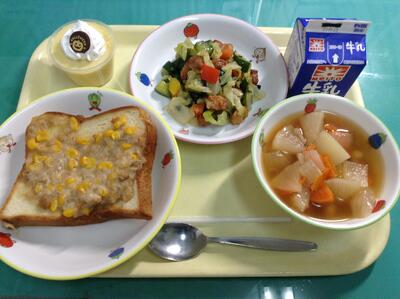 ツナコーントースト、竹輪のコロコロサラダ、ポトフ、ハロウィンデザート、牛乳