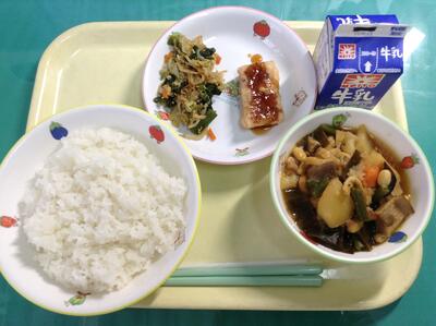 ごはん、いかの黒酢あんかけ、ごま和え、五目煮、牛乳