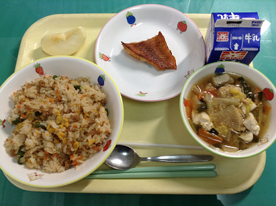 そぼろごはん、赤魚の西京焼き、ちゃんこ汁、りんご、牛乳
