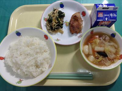 ごはん、鶏肉のはちみつバジル焼き、磯香和え、白玉汁、牛乳