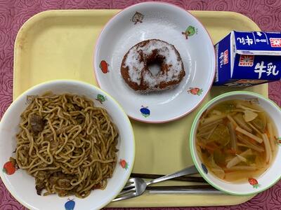 献 立 : 焼きそば、白菜のスープ、キャロットドーナッツ、牛乳