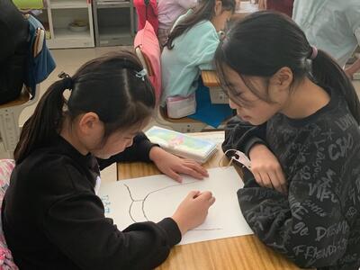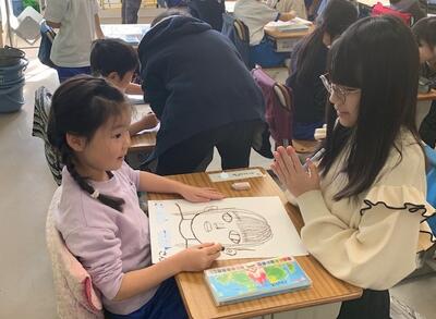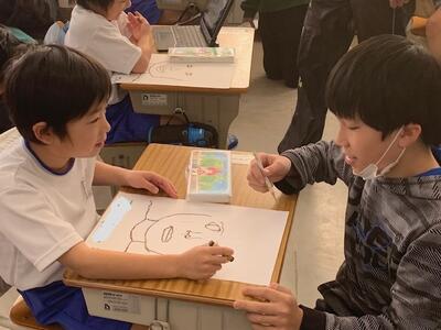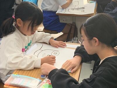 交流活動でお世話になった6年生のお兄さんお姉さんへの感謝の気持ちを込めて、1年生が似顔絵を描いています。