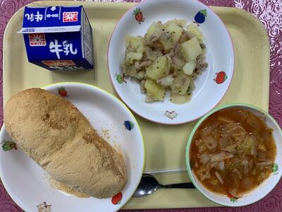 (献立): ハヤシライス、牛乳、白菜のスープ、お月見ゼリー