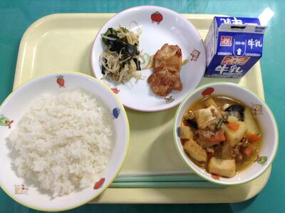 ごはん、鶏肉の照焼き、酢の物、生揚げの肉味噌煮、牛乳